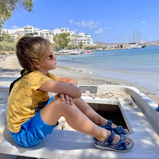 Matinée studieuse pour cette première vraie journée à Milos : Marius travaille sur ses cahiers, Papa étudie la géographie locale pour préparer la prochaine balade et Maman met à jour le site.